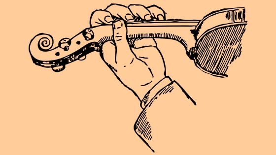 Рука находится в конце шейки скрипки. Держим шейку скрипки, не зажимая её, между первой фалангой большого и третьей фалангой указательного пальцев.